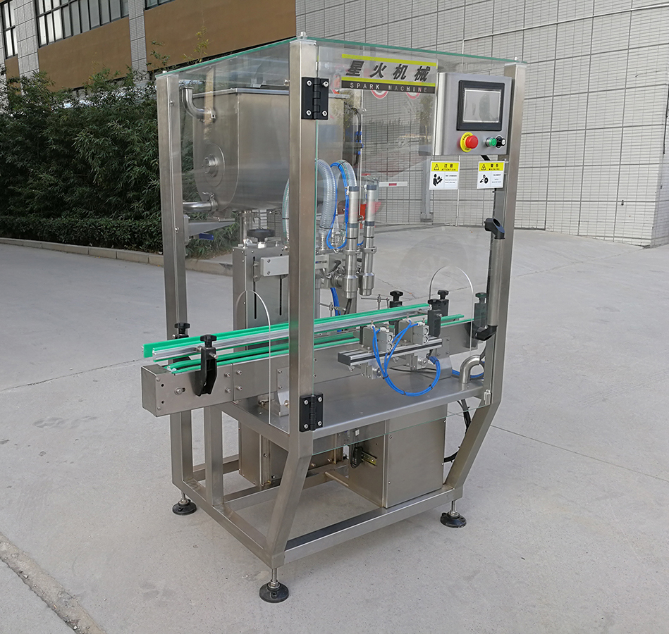 該機(jī)適合灌裝顆粒類(lèi)醬料,是全自動(dòng)辣椒醬灌裝機(jī)和豆豉醬灌裝機(jī)通用設(shè)備,目前在國(guó)內(nèi)屬于比較先進(jìn)的灌裝機(jī)產(chǎn)品,他的產(chǎn)生解決了以前辣椒醬廠家需要大量人力才能完成灌裝的難題,并且提高了產(chǎn)品的灌裝精度。該機(jī)和物料接觸部位全部采用316L不銹鋼制成,動(dòng)力使用臺(tái)灣亞德客氣缸推動(dòng),整機(jī)干凈大方、動(dòng)力強(qiáng)勁,使很多客戶順利解決了醬料生產(chǎn)企業(yè)QS認(rèn)證。
